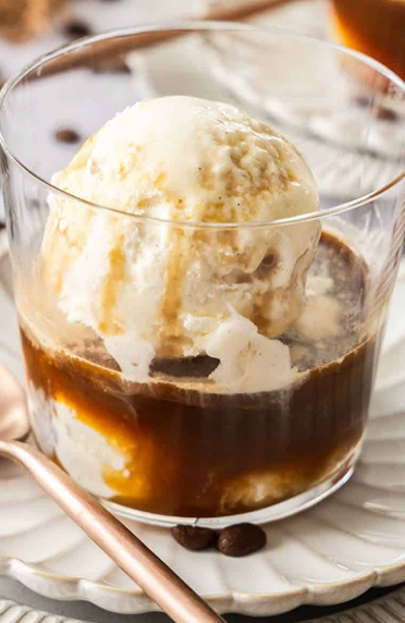 Espresso panas disajikan dengan es krim vanilla.